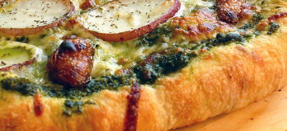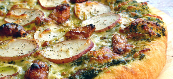 Using a large spoon, spread an even layer of the pesto onto the dough and carefully spread it to within 1/2-inch of the edge, being careful to leave a sauce free edge. Top with an even layer of the grated mozzarella/provolone cheese followed by slices of parboiled potatoes and roasted garlic cloves. Top with a light sprinkling of a bit more mozzarella, season with salt to taste and a pinch of red pepper flakes. Lightly brush the exposed crust with a bit of olive oil (or leftover garlic) oil to promote browning.